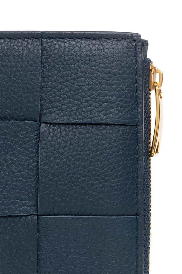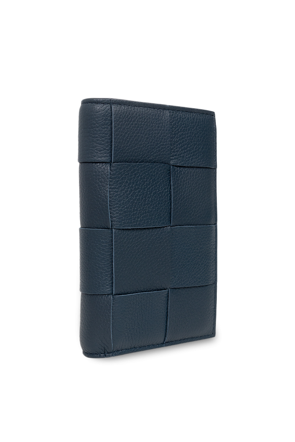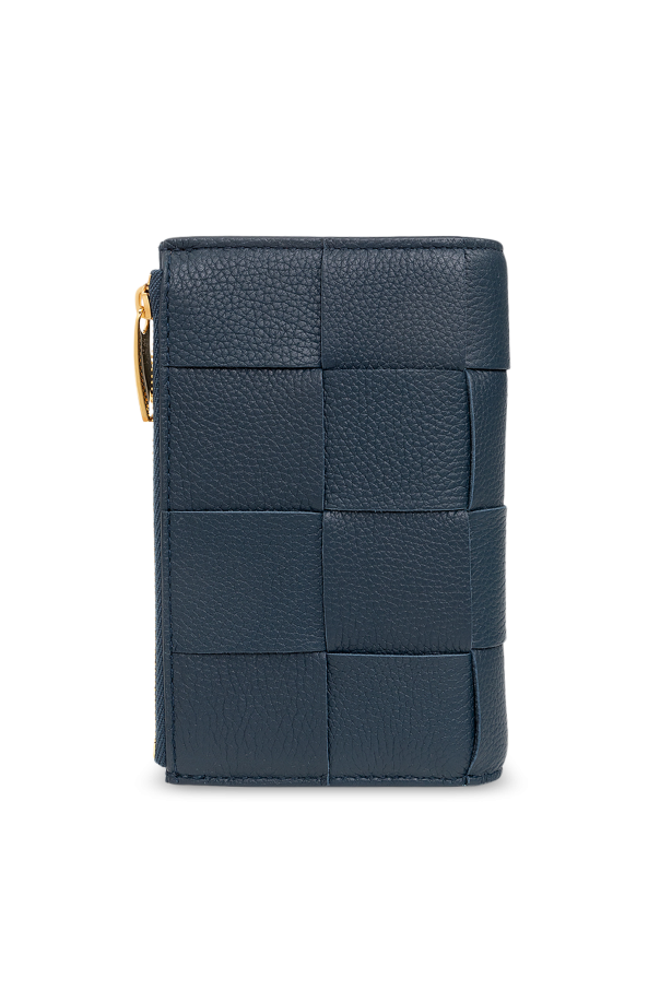 Navy blue wallet from Bottega Veneta. Crafted from calf leather and lamb leather with the brand's iconic Intreccio weave, this design secures with a snap and features gold-tone metal hardware, one zip coin pocket and a bill compartment, four slip pockets and ten card slots inside.