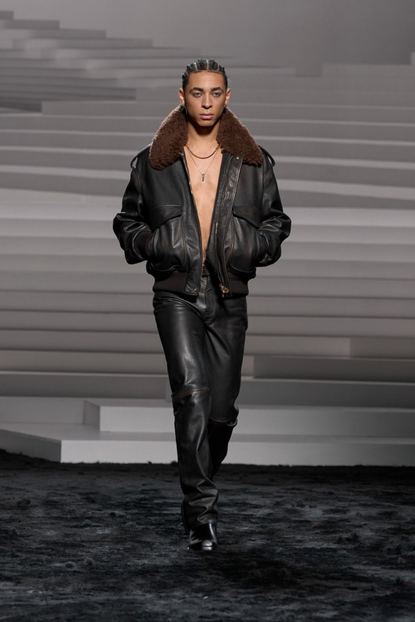 Presenting the Leather Jacket with Detachable Fur Collar by the illustrious Versace. This exquisite bomber jacket epitomizes luxury and sophistication, crafted from premium black goatskin leather with meticulous attention to detail. The jacket boasts a classic bomber silhouette, featuring broad shoulders, straight sleeves with gently rounded shoulders, and a form-fitting hem and cuffs made from knitted fabric for enhanced comfort and fit. The detachable dark brown fur collar adds a touch of elegance and versatility, making it suitable for various weather conditions. Functionality meets style with its two spacious external flap pockets at the waist, a front zipper concealed under an additional leather placket with snap closures, and distinctive stitched details on the shoulders. The jacket's authenticity is unmistakably marked by the embossed "VERSACE" and "E & T MILANO" on the upper back. The jacket's interior is lined with a patterned polyester fabric, providing a striking contrast to the distressed exterior finish. Epaulettes on the shoulders further accentuate its refined design. Why Buy This Product? Timeless bomber jacket design with modern touches. High-quality goatskin leather for durability and luxury. Detachable fur collar for adaptable elegance. Distinctive Versace branding ensures authenticity. Practical with ample pocket space and concealed closures.