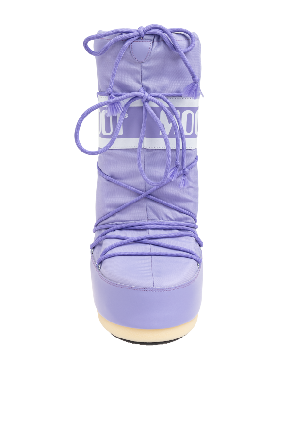 Behold the exquisite charm of the Icon Nylon Snow Boots from the esteemed Moon Boot collection. These purple snow boots encapsulate the perfect blend of functionality and high fashion. The classic high-top design ensures optimal protection against the winter chill and snow, while the durable nylon material provides resistance to moisture and ease of cleaning. The boots feature a monochromatic purple hue adorned with prominent Moon Boot logos, making a stylish statement. A wide white band at the top, emblazoned with the "MOON BOOT" insignia, and additional branding near the ankle, accentuate the boots' distinctive look. Matching purple laces offer a cohesive aesthetic, and the beige sole adds a subtle contrast, enhancing the overall elegance. Why Buy This Product? Exquisite Design: Monochromatic purple with signature Moon Boot logos. Superior Quality: Made from durable, moisture-resistant nylon. Functional Elegance: Classic high-top design for maximum protection. Distinctive Branding: Prominent logos for effortless brand recognition.
