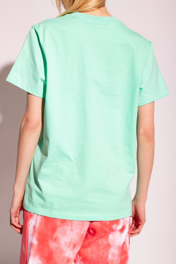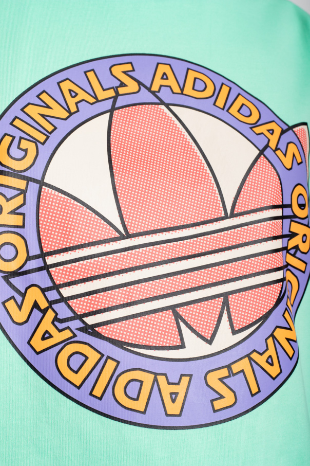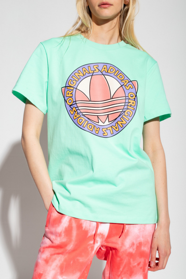 Light green crewneck T-shirt from ADIDAS Originals, the ‘End Plastic Waste’ line. Made of cotton from sustainable sources as part of the Better Cotton Initiative, this style showcases short sleeves, an elasticated collar and a colourful Trefoil logo print.