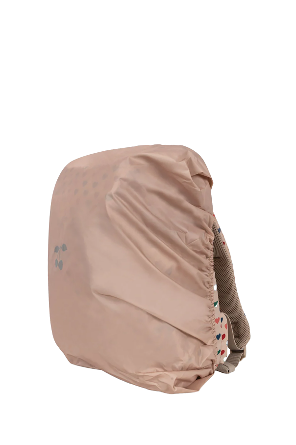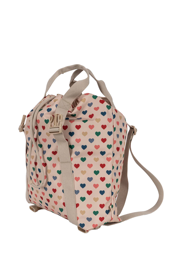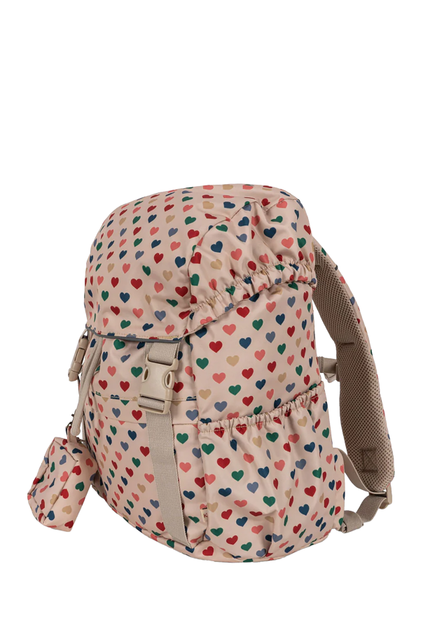 Introducing the Patterned Backpack from the exclusive children's collection by Konges Sløjd. This exquisite backpack embodies a classic rectangular shape with rounded edges, featuring a spacious main compartment secured by a flap with two snap buckles, and adorned with adjustable straps. The front showcases a small zippered pocket for added convenience. The backpack's elegant beige hue, embellished with a vibrant array of hearts in red, blue, green, pink, and beige, is sure to captivate. Crafted from water-resistant polyester, it ensures durability and protection against the elements. The sturdy beige straps further enhance its resilience. Designed with comfort in mind, the backpack boasts adjustable shoulder straps with an additional chest strap for optimal fit, a top handle for easy carrying, and side pockets with elastic drawstrings. It also includes a matching zippered pouch attached by a carabiner, perfect for small essentials. The integrated rain cover, easily accessible from an external pocket, and the ventilated padded back panel guarantee functionality and comfort, making this backpack a practical and stylish choice for children. Why Choose This Product? Elegant Design: Charming heart pattern in multiple colors. Superior Material: Water-resistant polyester for added durability. Exceptional Comfort: Adjustable straps and ventilated padding. Functional Features: Integrated rain cover and multiple pockets. Eco-Friendly: From a brand committed to sustainable production.