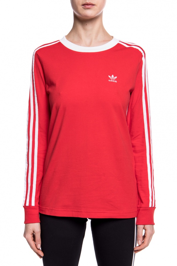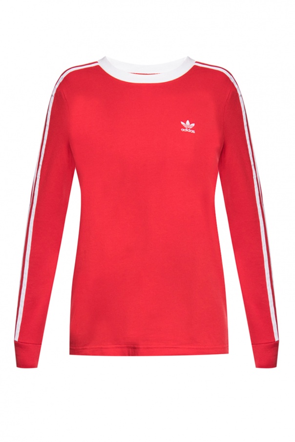Red T-shirt from ADIDAS Originals. Made of cotton. Decorated with sewn-on stripes and a white logo embroidery. Round neck. Long sleeves with elasticated cuffs.