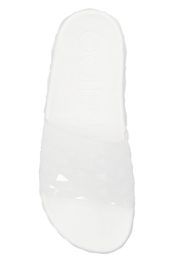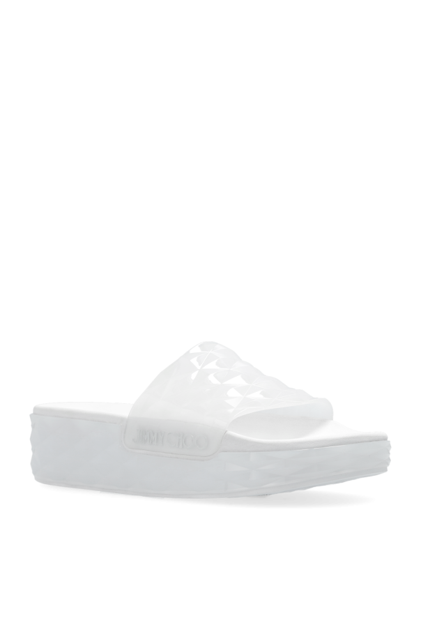 White ‘Diamond’ platform slides from Jimmy Choo. Made from rubber, this model showcases a silver-tone logo.