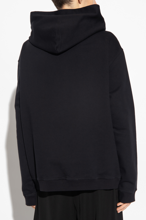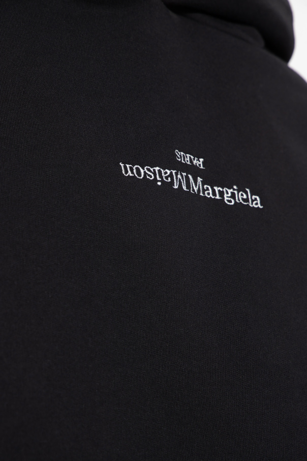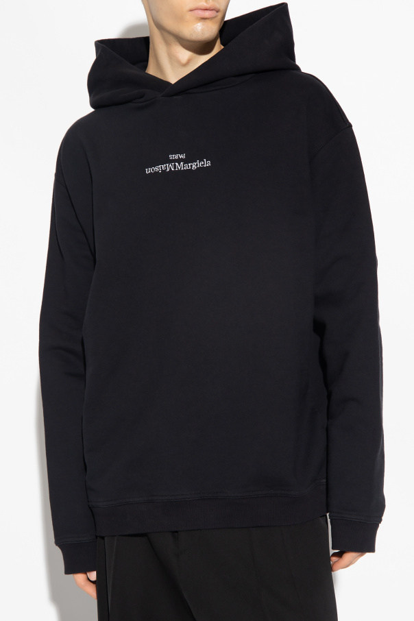 Black hoodie from Maison Margiela. Made of cotton, this style features white logo embroidery on the front, ribbing on the bottom hem and long sleeves and the brand's signature white four stitches on the back.