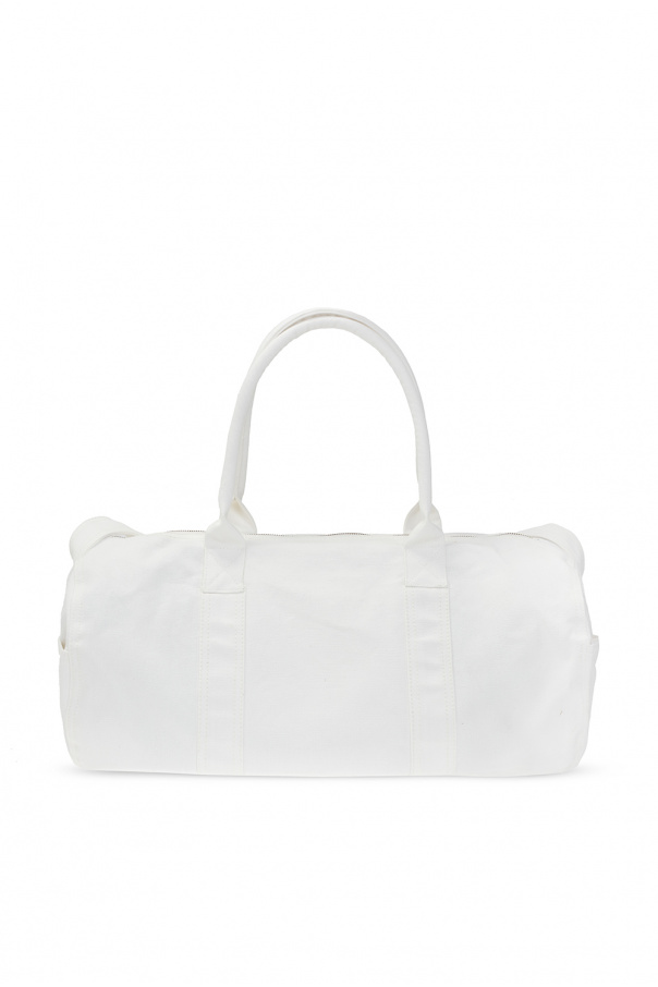 White holdall bag from Isabel Marant. Fastened with a zip, this design features a velour logo pattern in maroon, four slip pockets, two half-round handles, shoulder strap, silver-tone metal hardware and one internal compartment with one slip pocket.