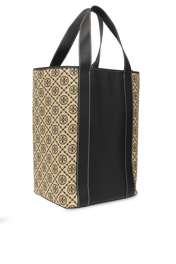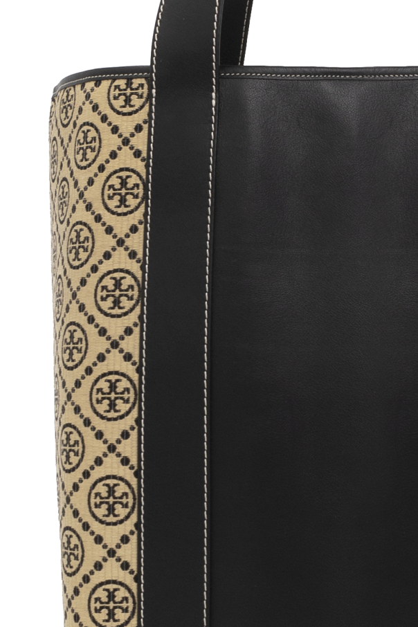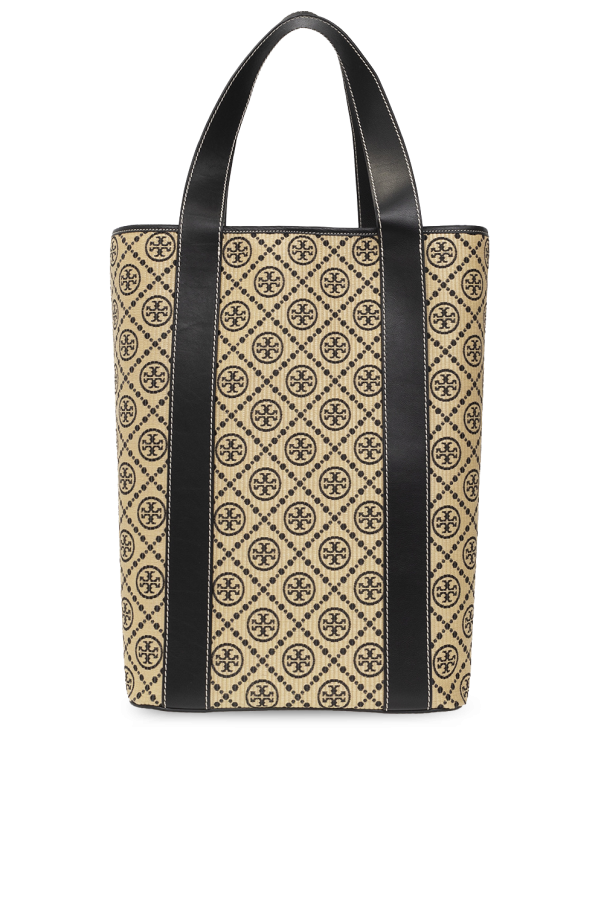 Beige and black shopper bag from Tory Burch. Crafted from soft raffia material, this design cinches closed with drawstrings and showcases the brand's monogram, leather trims, to half-round straps and one internal compartment with a zip pocket.
