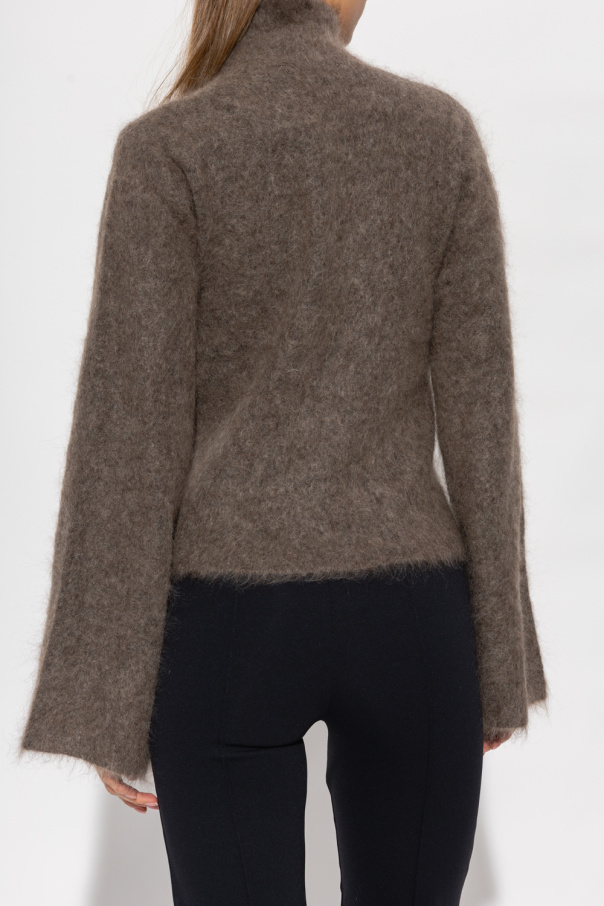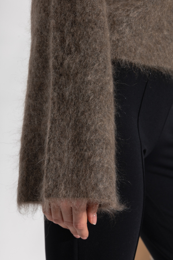 Brown furry sweater from Gestuz. Crafted from mohair, this garment has ribbed trims at the hem and cuffs.