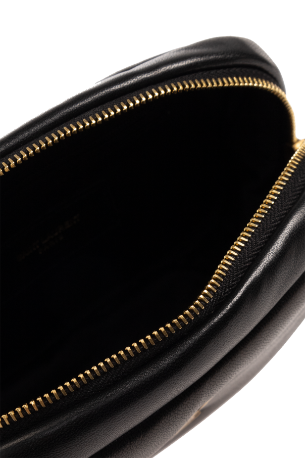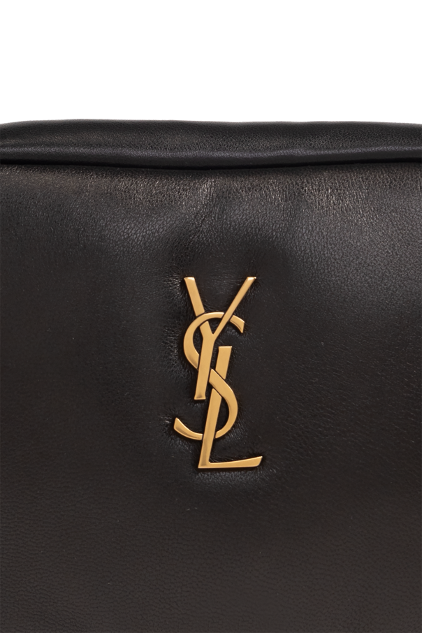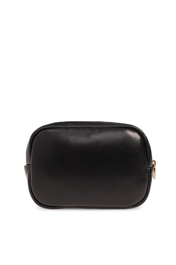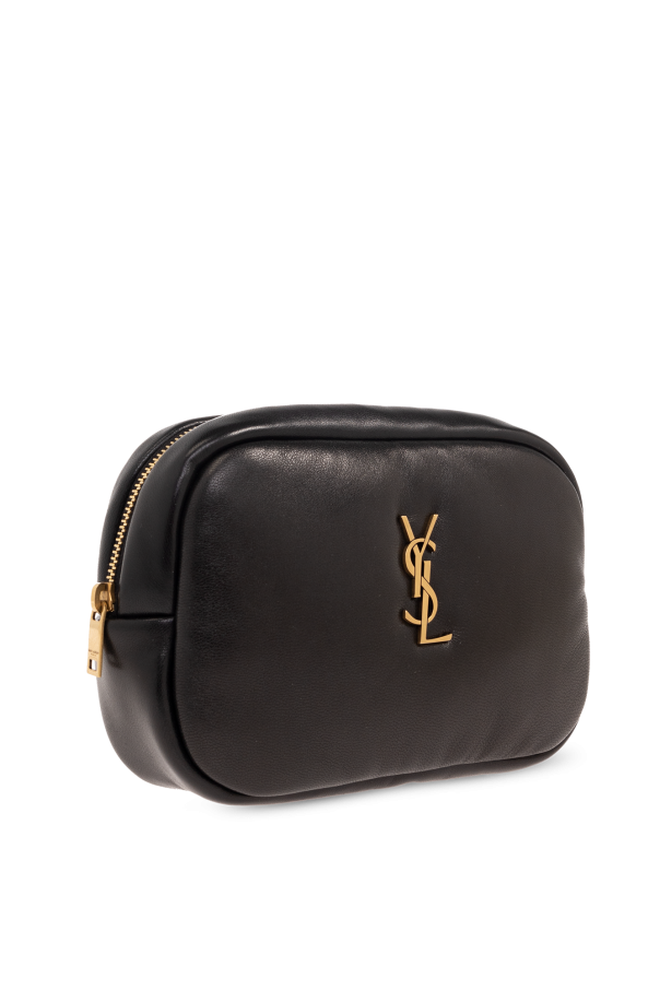Black wash bag from Saint Laurent. Made of lamb leather, this design secures with a zip and features a logo application on the front, gold-tone metal hardware as well as one internal compartment with a zip pocket.