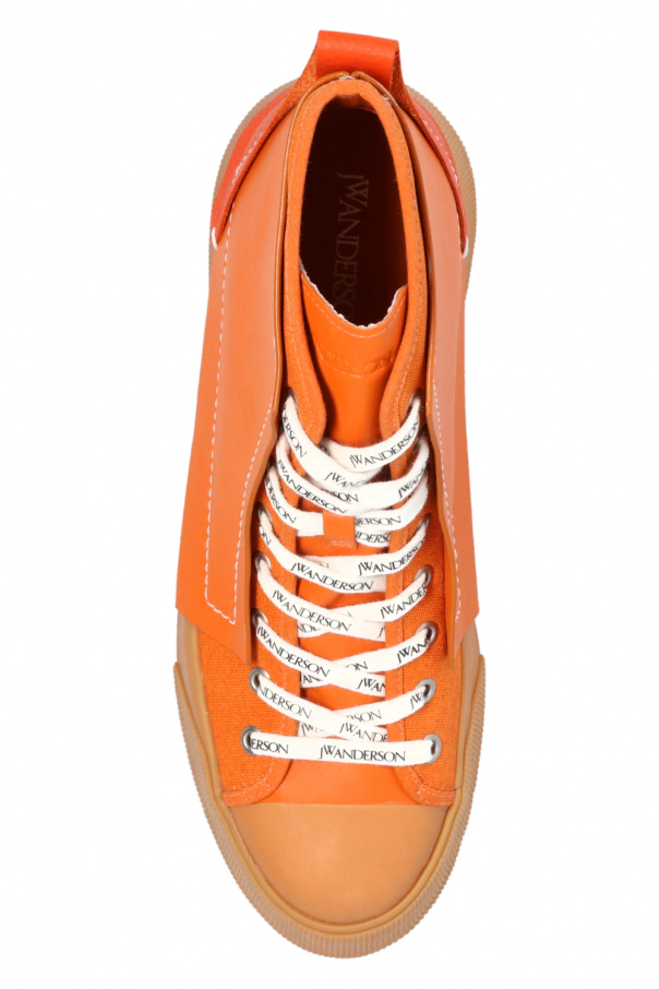 Orange high-top sneakers from JW Anderson. Trimmed with leather, this lace-up pair features a logo embossed on the tongue and a beige rubber sole.