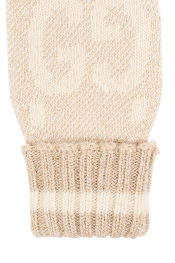 Beige and cream gloves from Gucci. Crafted from cashmere, this design features gold-tone metallic threads, a monogram pattern and turned up ribbed cuffs.