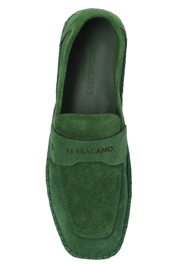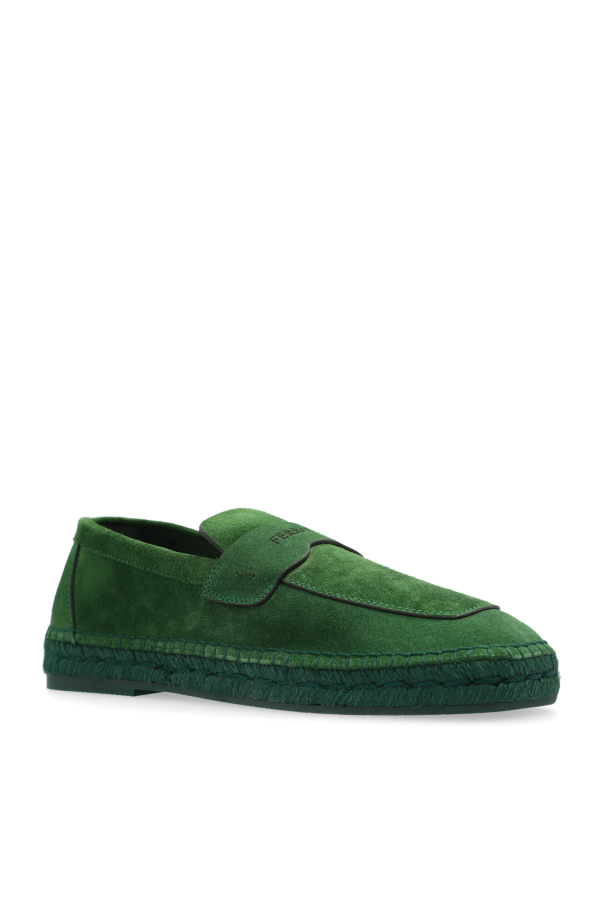 Introducing the 'Desco' men's espadrilles by FERRAGAMO, a testament to refined craftsmanship and sartorial elegance. These exquisite shoes, rendered in a deep green hue, epitomize luxury footwear. Crafted from high-quality materials reminiscent of suede, they feature a supple calfskin and lamb leather interior, ensuring peerless comfort and durability. The distinctive flat sole, a hallmark of espadrille design, is ingeniously finished with a jute-like appearance, offering both style and stability. The sleek, unadorned upper, save for a subtle embossed 'FERRAGAMO' logo, boasts a unique raised area around the midfoot for added support, while the round toe is elegantly divided by a characteristic seam. These 'Desco' espadrilles are not merely shoes, but a piece of art that seamlessly integrates into any sophisticated wardrobe, as illustrated in the accompanying visuals. Their versatility is evident, harmonizing effortlessly with wide-leg trousers and a light green patterned shirt, presenting an ensemble of understated luxury. Why Choose the 'Desco' Espadrilles? Exquisite Craftsmanship: Meticulously crafted from suede-like materials with a luxurious calfskin and lamb leather lining. Signature Design Elements: The jute-finished rubber sole and embossed designer logo on the tongue reflect the brand's attention to detail. Unparalleled Comfort: The thoughtful construction, including a supportive midfoot area and a 'Medium' insole, ensures all-day comfort. Iconic Style: A deep green palette and timeless design make these espadrilles a versatile addition to any discerning gentleman's wardrobe.