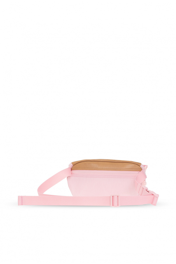 Pink and brown belt bag from VETEMENTS. Embroidered at front with a colourful logo, this design features a two-way zip fastening, a back zip pocket, an adjustable strap, pink metal hardware and one internal compartment.