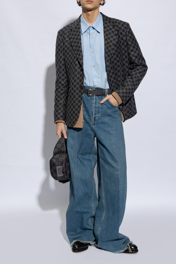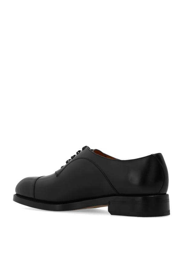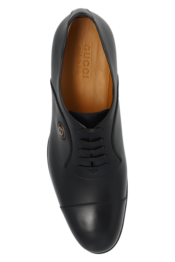 Black Oxford shoes from Gucci. Made of leather, this lace-up model sits on a light brown leather sole and showcases a logo application on the side.