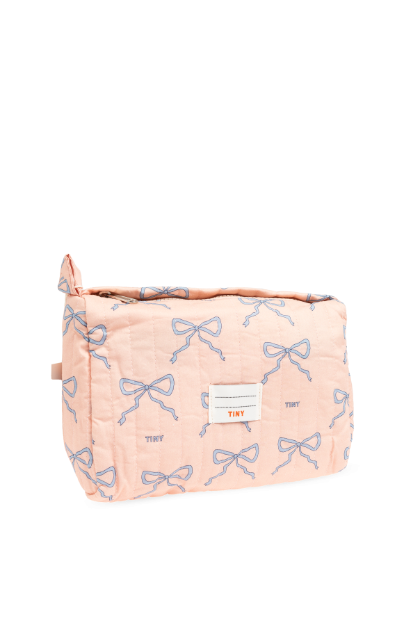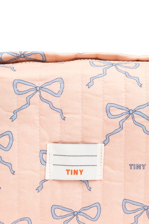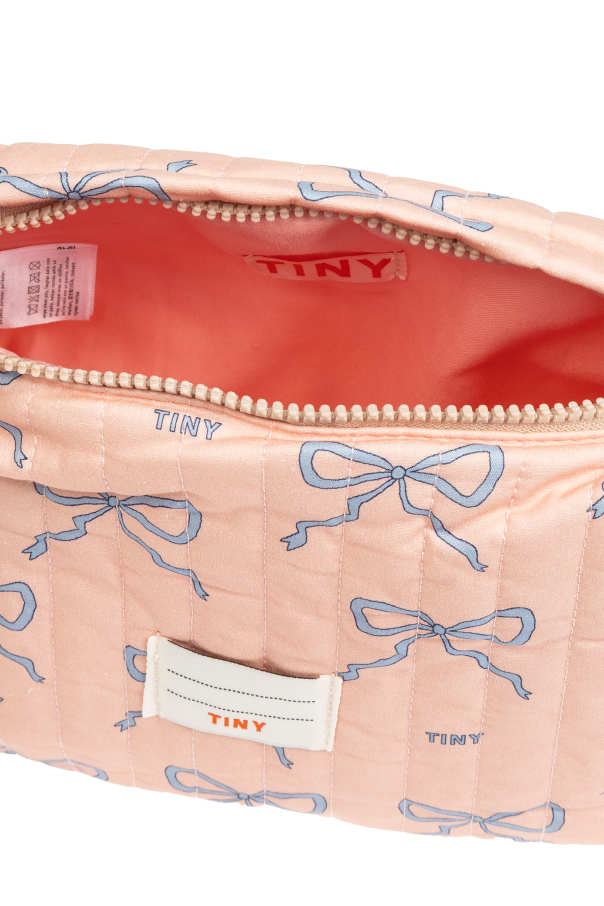 Presenting the Bow Pattern Cosmetic Bag from the exclusive children's collection by Tiny Cottons. This exquisite accessory is meticulously crafted to delight young ones with its charming design and practical features. The cosmetic bag boasts a rectangular shape with gently rounded edges, offering a soft and inviting appearance. Made from quilted cotton, it combines a plush texture with durability. The bag is adorned with a delightful pattern of blue bows, adding a touch of whimsy to its elegant design. The cosmetic bag is predominantly light pink and features the brand's signature "TINY" logo printed in various places, including a patch on the front. The pink zipper adds a playful yet sophisticated touch, while the interior is lined with matching pink fabric, providing both style and functionality. Inside, you'll find a spacious compartment and a slip pocket, perfect for organizing small items. Tiny Cottons, founded in 2012 in Barcelona by Barb Bruno and Gerard Lazcano, infuses their designs with the vibrant spirit of their cosmopolitan city, fairy tale inspirations, and travel adventures. Their commitment to expert craftsmanship and playful motifs ensures that young trendsetters can explore the world with joy and style. Why Choose This Product? Exquisite Design: Features a charming blue bow pattern on a light pink quilted surface. Premium Material: Made from soft and durable cotton. Functional: Includes a spacious interior compartment and a slip pocket for easy organization. Exclusive Brand: From the acclaimed Tiny Cottons, known for their creative and stylish children's accessories.