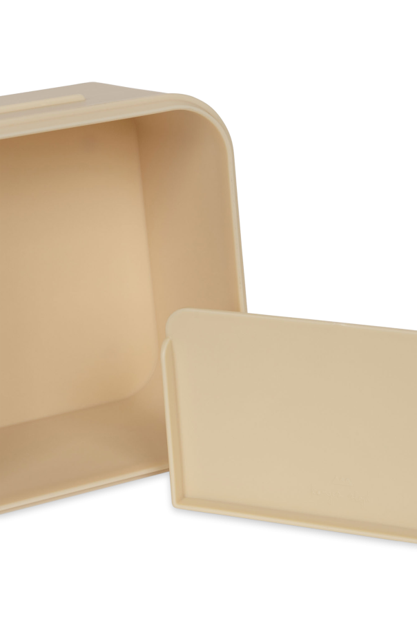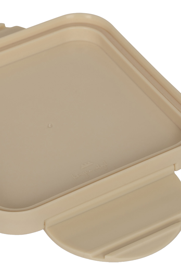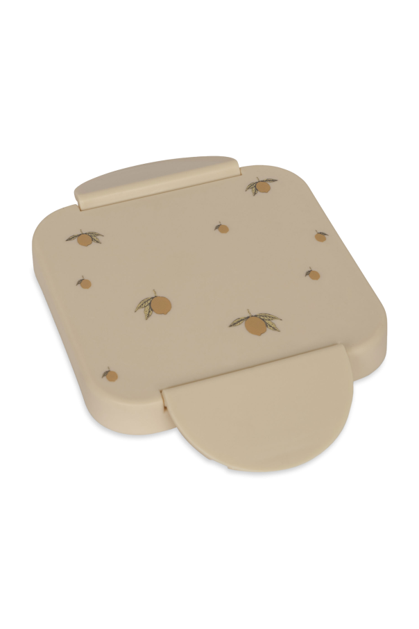 Beige lunch box from Konges Slojd. Embellished with a yellow and green lemon print, this item fastens with snaps and features one internal compartment with a removable divider. Dishwasher safe.