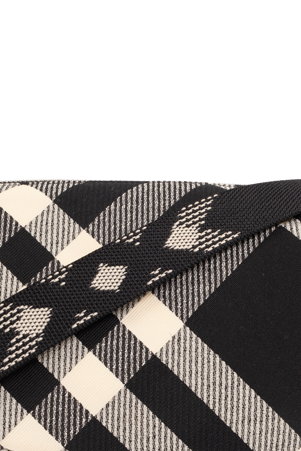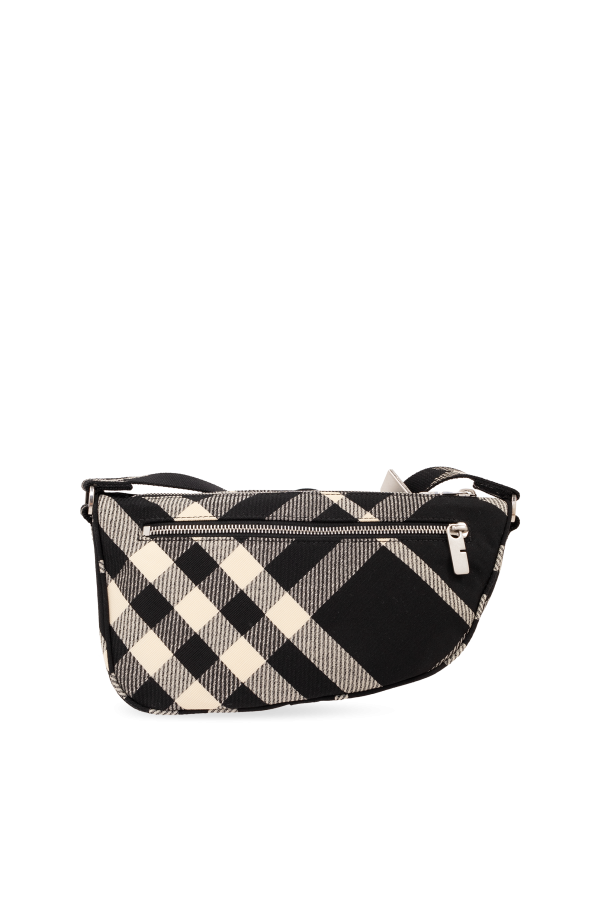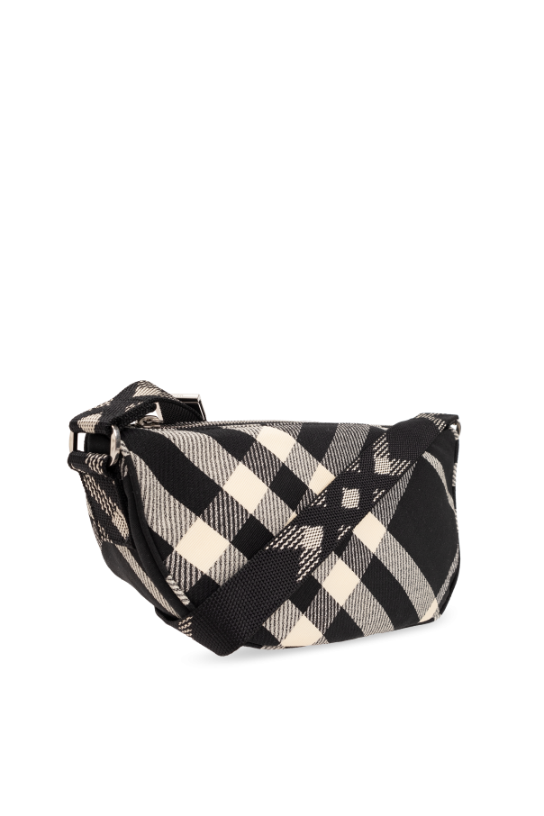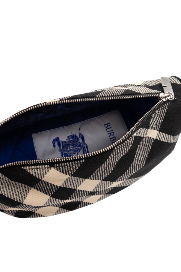 Introducing the 'Small Shield' Belt Bag by Burberry, a quintessential accessory that exudes sophistication and practicality. Crafted with an eye-catching black and white check pattern, this bag is the epitome of style meets function. The textured material, a blend of polyester and cotton, promises durability and a premium feel. The bag's rounded shape and zipper closure ensure your belongings are secure and easily accessible. An adjustable strap offers versatile wearability, allowing you to sport the bag across the body for convenience and safety. The striking blue interior lining contrasts beautifully with the exterior, adding an unexpected pop of color to this elegant piece. Additionally, the interior designer logo label is a testament to Burberry's attention to detail and brand prestige. Why Choose This Product? Exquisite black and white check pattern design by Burberry. High-quality material: Crafted from polyester and cotton for durability and a refined texture. Adjustable strap for personalized fit and comfort. Convenient zipper closure and internal compartment for secure storage. Iconic designer logo detailing for an added touch of luxury.