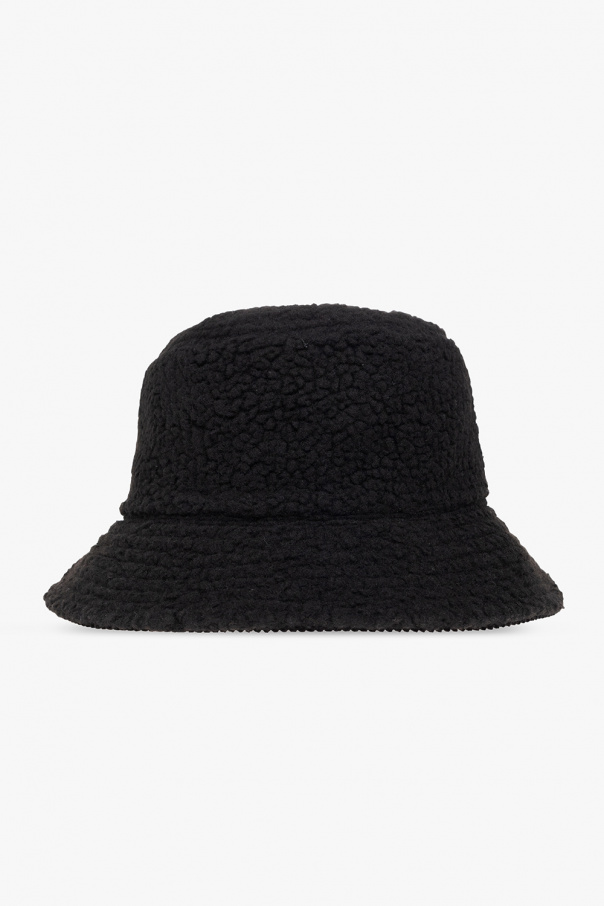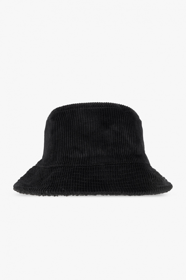 Black ribbed bucket hat with an embroidered logo pattern from AllSaints.