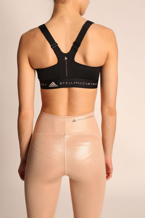Black sports bra from ADIDAS by Stella McCartney, the ‘Primegreen’ line. Crafted from moisture-absorbing AEROREADY fabric, this style showcases a front zipper, adjustable shoulder straps and an elastic hem with an embroidered logo in cream.