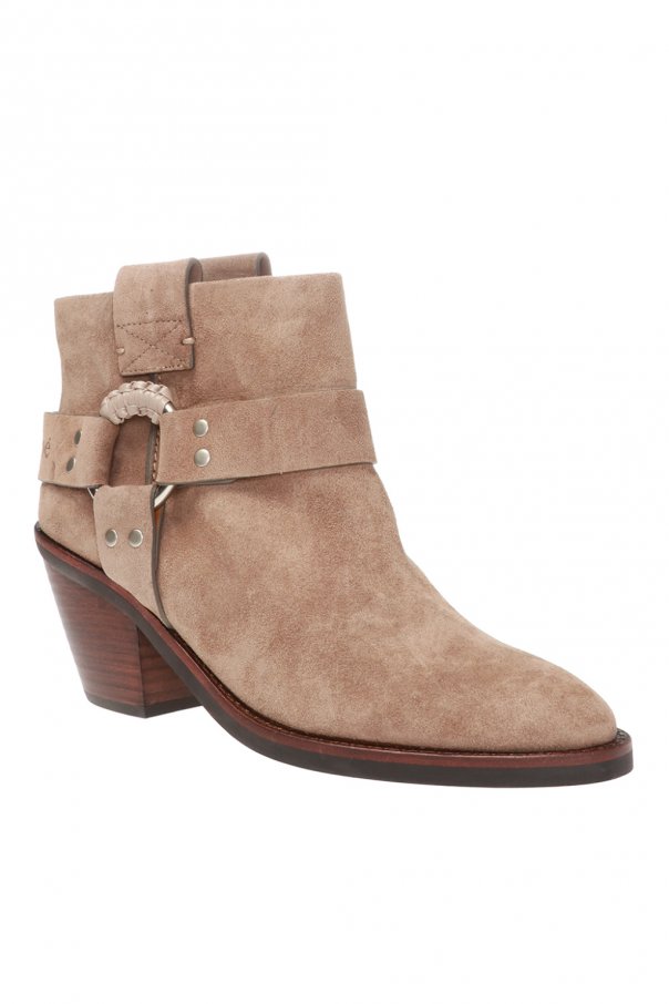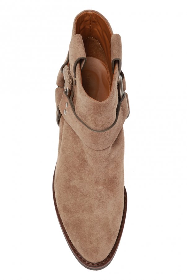 Brown ‘Eddie’ heeled ankle boots from See By Chloé. Made of suede. Embellished with studded harness with leather-braided ring. They are seated on a black rubber sole.
