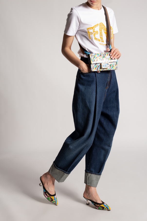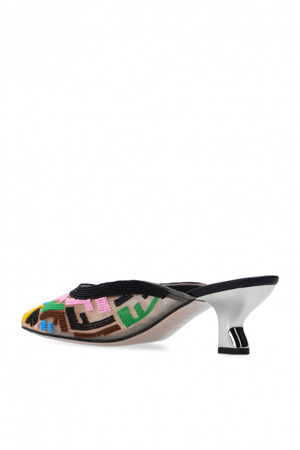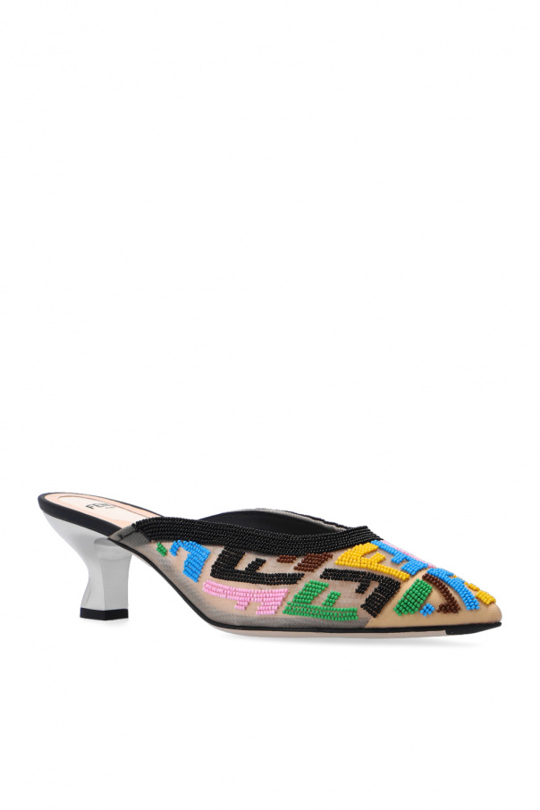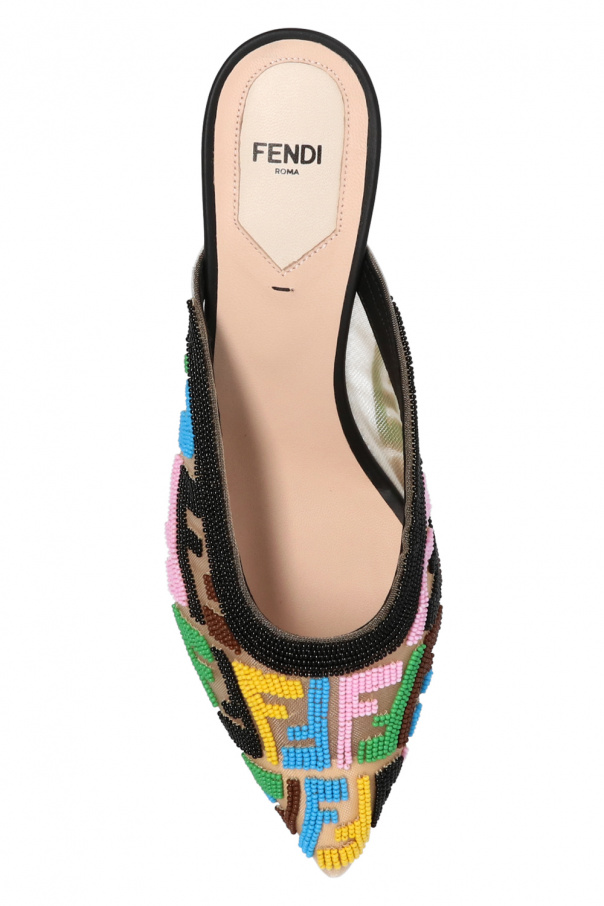 Multicoloured mules from Fendi. Embroidered with a logo pattern, they boast a pointed-toe silhouette set on a beige leather sole.