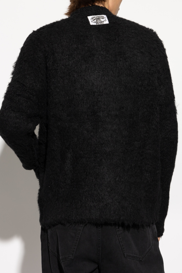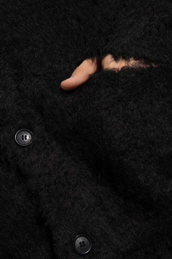 Introducing the Black Wool Cardigan, an embodiment of sophistication and comfort from the exclusive men's collection by Acne Studios. This cardigan is meticulously crafted from premium wool, endowing it with a soft texture reminiscent of delicate fur. The cardigan features a simple yet refined design with a slightly tailored fit, long sleeves, and a straight hem. It is adorned with five evenly spaced black buttons along the front, providing a sleek closure. The raw edges at the cuffs, hem, and neckline lend a contemporary, slightly nonchalant aesthetic. Discreetly integrated into the design are two side slip pockets, enhancing both functionality and elegance. A signature designer logo patch, white with black print, graces the back of the collar, adding a subtle touch of exclusivity. Why Choose This Product? Luxurious wool material for ultimate softness and warmth. Sleek design with a slightly tailored fit. Modern raw edges that add a unique, stylish touch. Convenient side slip pockets for practicality. Signature designer logo for a mark of exclusivity.