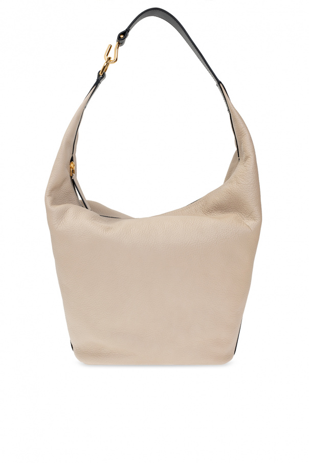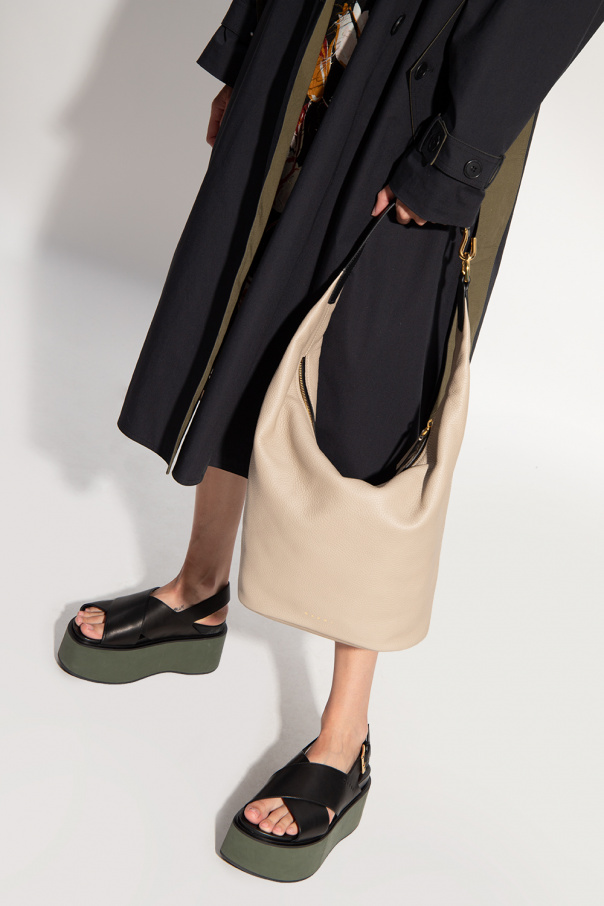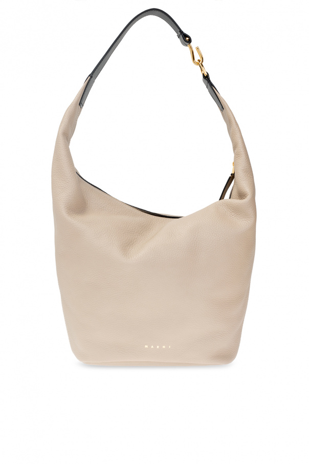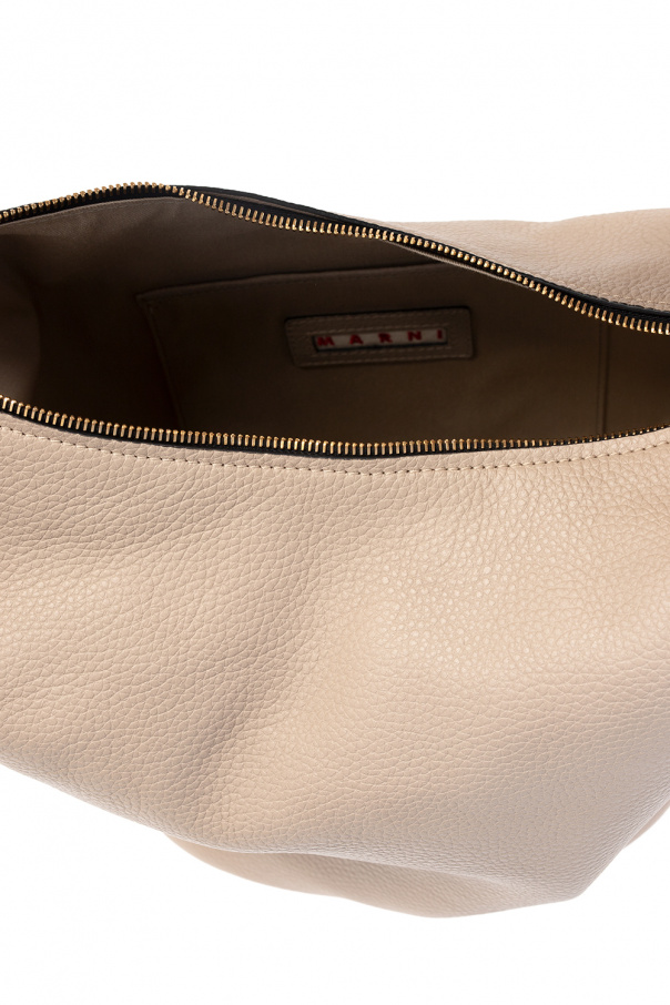 Beige and black handbag from Marni. Crafted from leather, this design secures with a zip and showcases a gold-tone logo print, a half-round handle, gold-tone metal hardware and one internal compartment with a slip pocket.