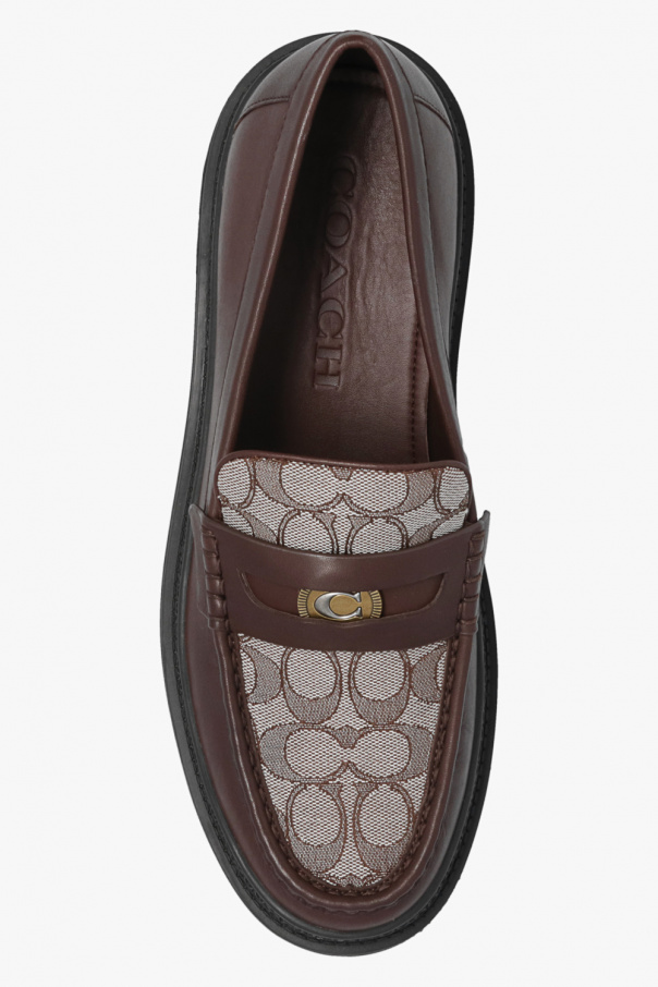 Brown and cream ‘Sig’ loafers from Coach. Crafted from leather, this model sits on a black rubber sole and showcases monogrammed canvas detailing and a front strap with logo hardware.