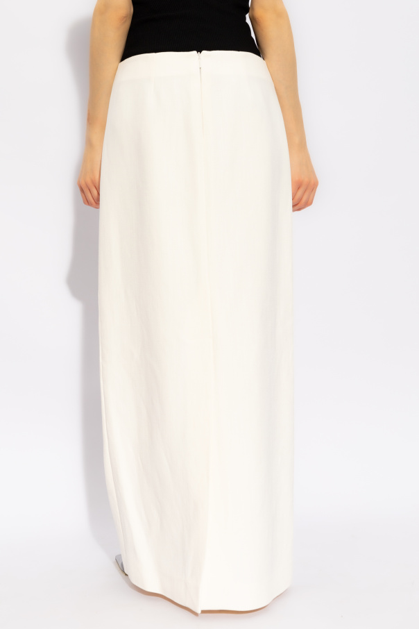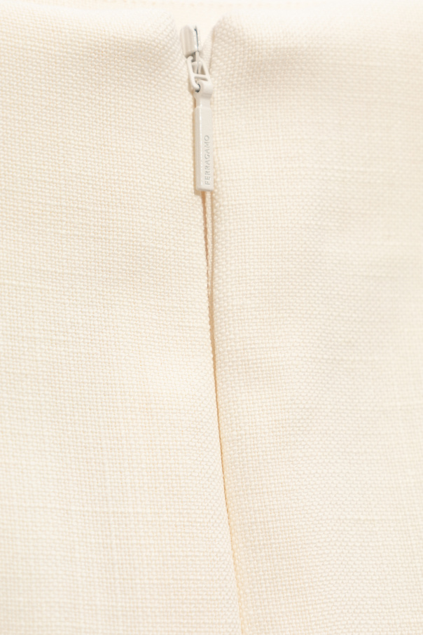 Introducing the epitome of timeless elegance: the Cream Back-Slit Skirt from the exclusive FERRAGAMO collection. Crafted with a harmonious blend of viscose and linen, this long skirt effortlessly marries comfort with luxury. Its creamy hue exudes sophistication, making it a versatile addition to any wardrobe. Designed for the discerning woman, the skirt features a simple yet flattering silhouette that gently flares towards the ground, creating an air of graceful movement. The highlight of this exquisite piece is the delicate back slit, which not only adds a touch of allure but also ensures freedom of movement. Secured at the rear with a zip closure, which is subtly adorned with the FERRAGAMO logo, this detail speaks volumes of the craftsmanship and attention to detail synonymous with the brand. The skirt's material boasts a slightly textured weave, lending a tactile quality that complements its smooth appearance. Whether paired with a sleek top for an evening out or styled casually for daytime elegance, this skirt is a testament to the unwavering appeal of well-considered design. Why Purchase This Product? Elegant and timeless design suitable for various occasions. Made from high-quality, breathable materials for ultimate comfort. Features a unique back slit for style and practicality. Exquisite craftsmanship with discreet branding for an exclusive feel.
