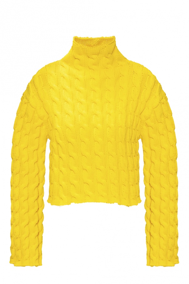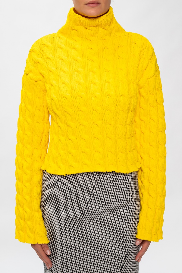 Yellow turtleneck sweater from Balenciaga. This piece of knitwear comes decorated with a black and white logo patch.