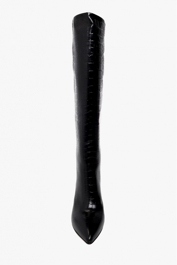 Black heeled boots from Paris Texas. Crafted from leather with a crocodile skin effect, this pointed toe design rests on a light brown leather sole.