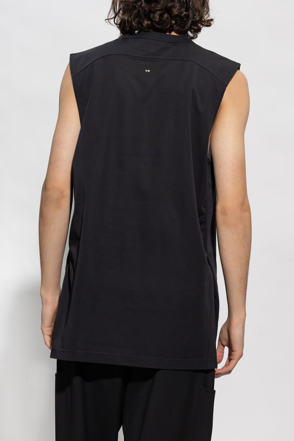 Black sleeveless T-shirt from Y-3 Yohji Yamamoto. Crafted from a blend of cotton and recycled material, this style features a back logo application, side slits and ribbing on the round neck.