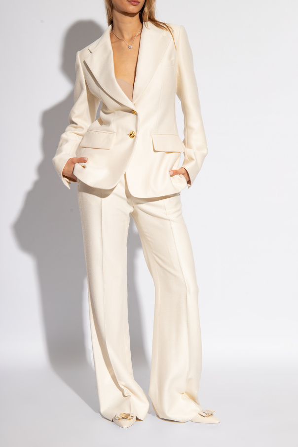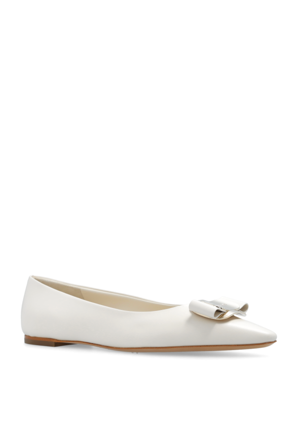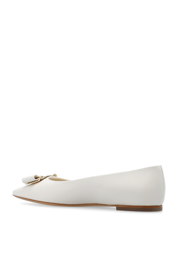 Cream ‘Zea’ ballet flats from FERRAGAMO. Made of leather and fabric, this model sits on a beige leather sole and showcases a pointed-toe silhouette, a logo-engraved bow and a standard-width footbed.