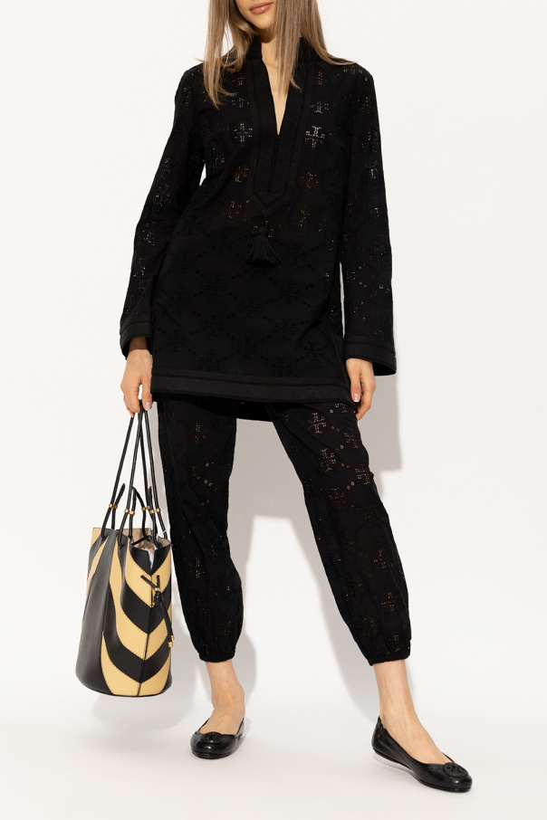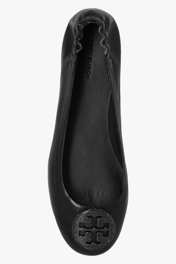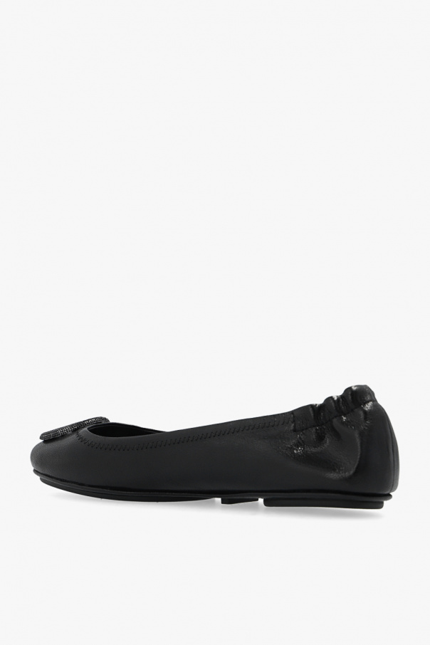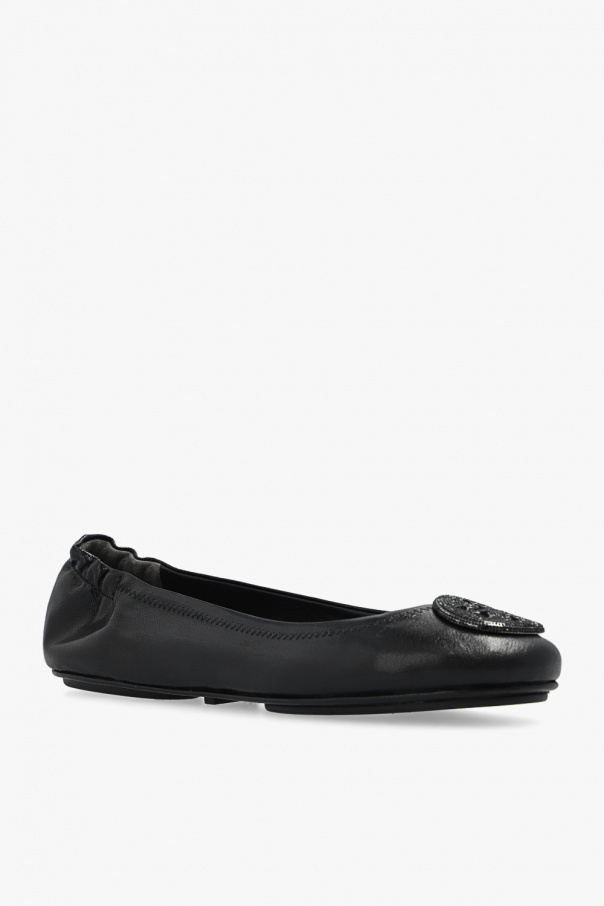 Black ‘Minnie’ ballet flats from Tory Burch. Crafted from leather, this model sits on a black rubber sole and features a back elastic trim and a front logo appliqué embellished with glossy crystals using the pavé technique.