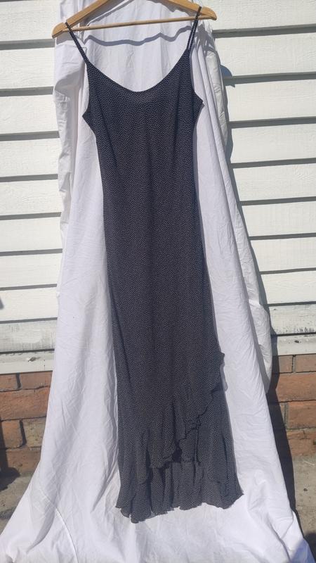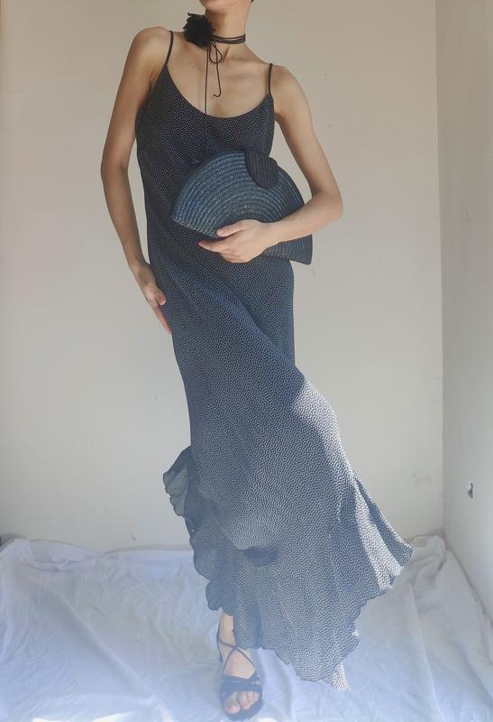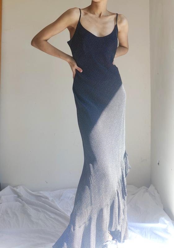 Винтажное платье макси в мелкий горошек из вискозы . Элегантный фасон , подол при ходьбе выглядит очень интересно. Идеальное винтажное состояние, в одном месте зашила пол сантиметра по шву (10фото), в цене учтено в носке не заметно .