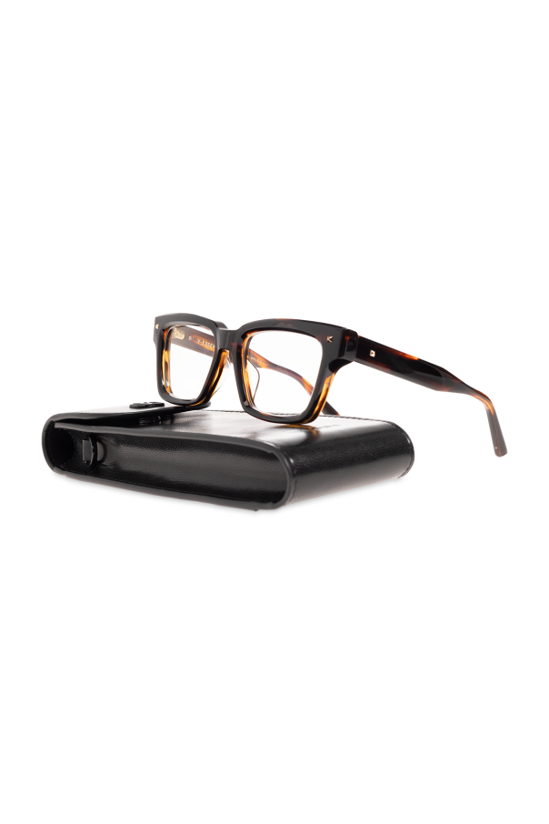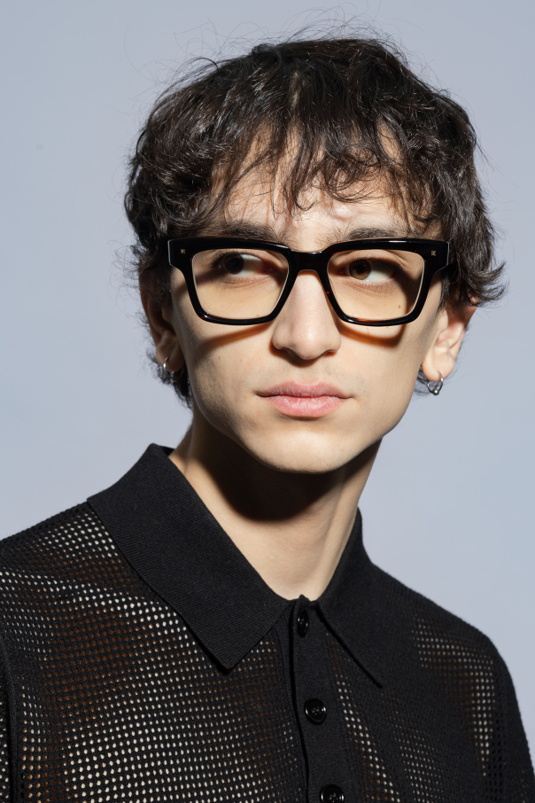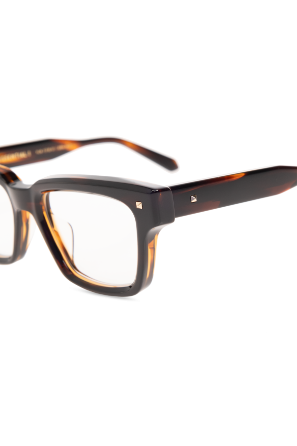 Brown optical glasses from Valentino Eyewear. This cat-eye pair features side inserts with a logo and clear lenses. Case included.