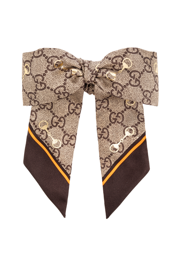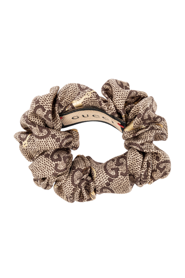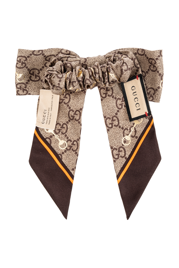 Two-piece scrunchie set in beige and brown from Gucci. Both items are embellished with a monogram pattern and gold-tone horsebit motif. One has a decorative bow.