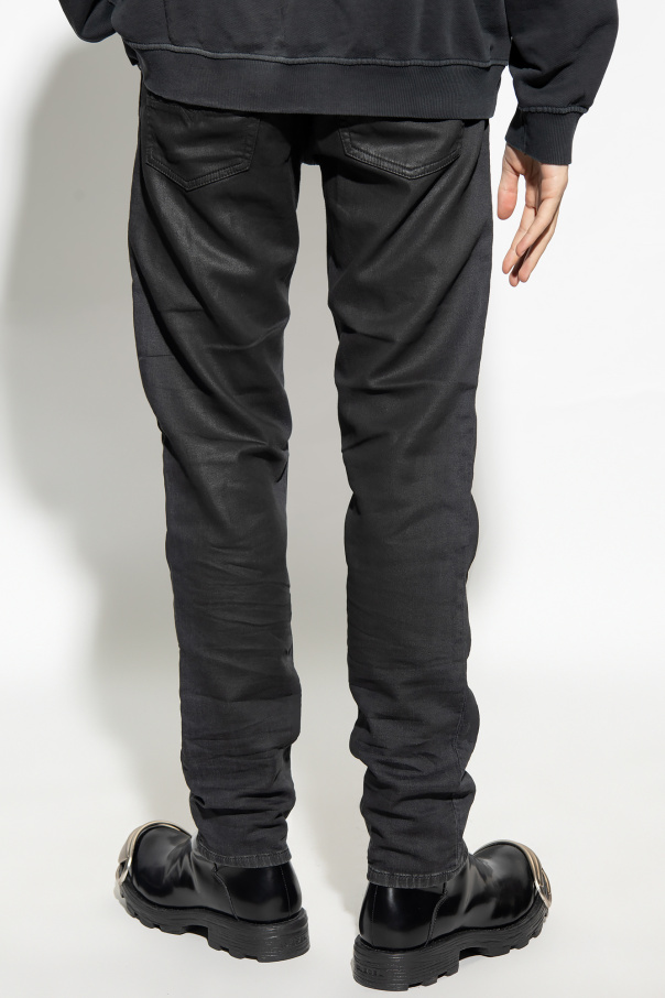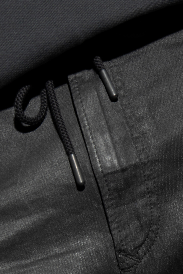 Black ‘KROOLEY-E-NE’ jeans from Diesel. Fastened with a zip, button and drawstrings, this pair falls with slightly tapered legs and is complete with a logo patch, three front pockets and two back pockets.