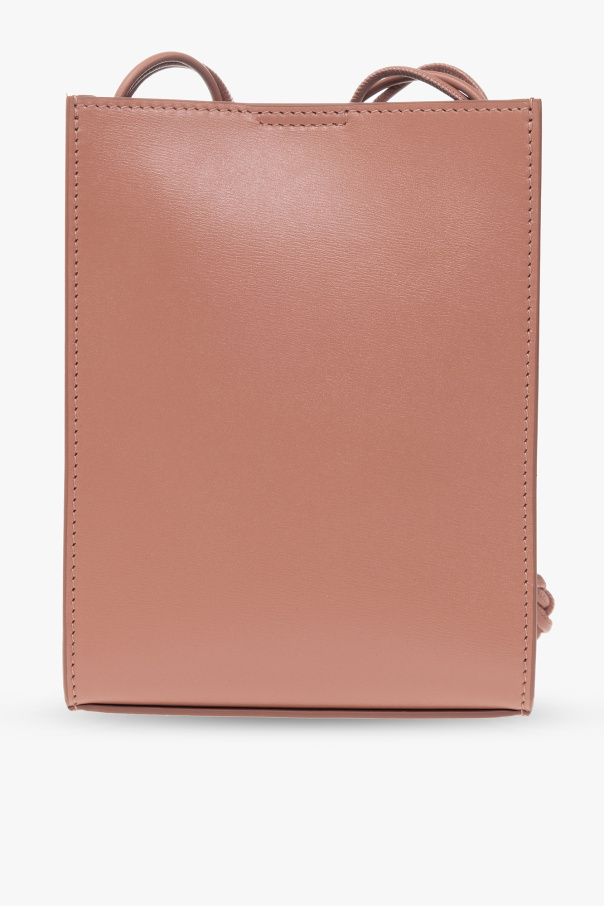 Brownish pink ‘Tangle Small’ phone holder from JIL SANDER. Crafted from leather, this design secures with a magnetic snap and showcases a printed gold-tone logo on the front. It is complete with a hand-woven shoulder strap, gold-tone metal hardware and one internal compartment.
