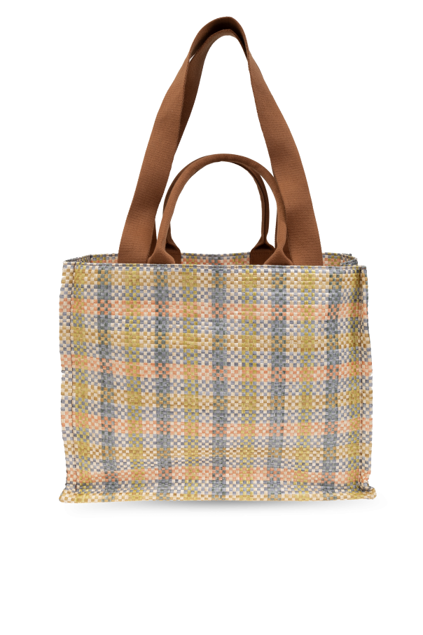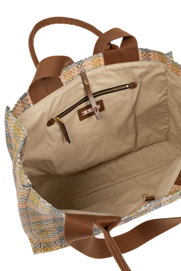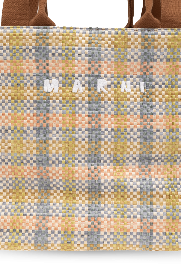 Introducing the ‘Tropicalia’ Shopper Bag by Marni, a symphony of functionality and style that caters to the discerning tastes of exclusive fashion connoisseurs. Crafted with an eye for detail, this multicolored marvel boasts a checkerboard pattern in soft hues of beige, yellow, and blue, making it a vibrant addition to any ensemble. Constructed from a durable polyamide material that mimics the texture of raffia, this bag is designed to withstand the rigors of daily use while maintaining its elegant appearance. Its rectangular shape and solid base allow for easy placement on any flat surface, ensuring your belongings stay upright and secure. The bag features two long handles, enabling comfortable shoulder carry for day-long convenience. The front of the bag is adorned with the designer's logo, meticulously embroidered in white thread, standing out against the colorful backdrop for an unmistakable mark of luxury. The interior is thoughtfully lined with a neutral fabric, safeguarding your essentials, complemented by a zippered pocket for securing small items. Gold metal finishing adds a final touch of sophistication, reflecting Marni's commitment to excellence. Why Purchase This Product? Exclusive Design: Stand out with the unique checkerboard pattern and the prestigious Marni logo. High-Quality Materials: Durable polyamide and meticulous craftsmanship ensure longevity. Functional Elegance: Spacious interior with a zippered pocket meets practical needs in style. Luxury Detailing: Gold metal finishing and embroidered logo underscore the bag’s exclusive character.