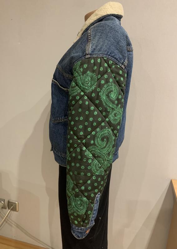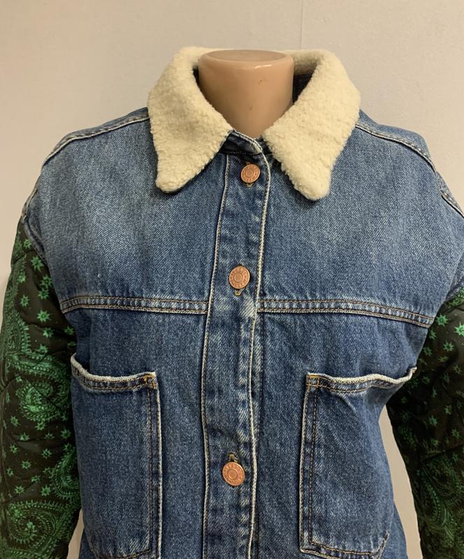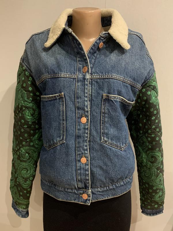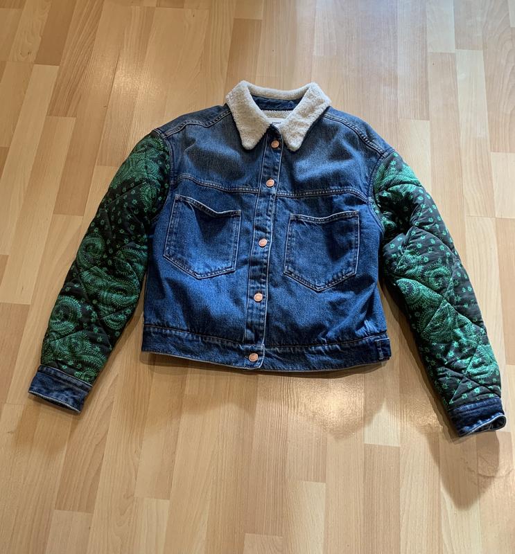 Крутая джинсовая утепленная куртка, комбинированный рукав стеганый в принте, очень стильная, модная, актуальная модель дорогого бренда. Пуговицы оригинальные с логотипом бренда.Тепла, оригинальная, безposансов. Пог 52 см,ПО по низу 47 см, плечи 52 см, рукав 57 см, от горловины 76 см. Купила на официальном сайте
