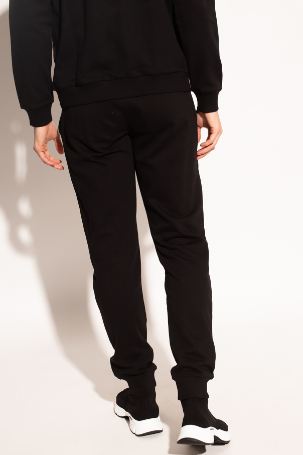 Black sweatpants from John Richmond. Made of cotton, this design features a drawstring waist, black and red logo print, two slip pockets and ribbed cuffs.