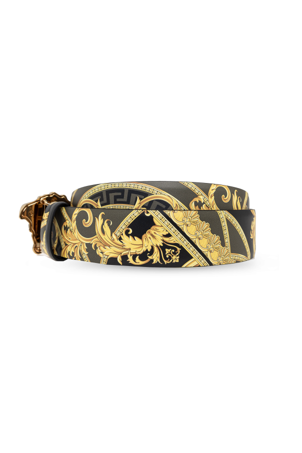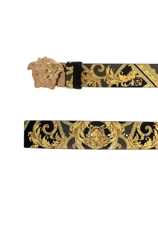 Introducing the Versace Double-Sided Belt, a quintessence of elegance and versatility that accentuates the exclusivity of our premium fashion collection. Crafted with an exquisite blend of calfskin leather and metal, this accessory stands as a testament to superior quality and sophisticated design. The belt showcases a vibrant yellow hue, adorned with black details and golden motifs that evoke a sense of luxury and opulence. The intricate Barocco pattern on one side serves as a hallmark of Versace's renowned aesthetic, offering a lavish touch to any ensemble. A centerpiece of this magnificent belt is the large lion head buckle, meticulously crafted in gold-toned metal, symbolizing strength and prestige while functioning as both a secure fastener and a statement decoration. Its reversible feature adds an element of practicality and flexibility, allowing for seamless integration with a diverse range of wardrobe choices. Whether paired with formal attire or casual wear, this belt's unique design and detailed embellishments make it an ideal accessory for those who appreciate exclusivity and refined additions to their style. Why Purchase This Product? Emblematic Versace design with Barocco patterns for an unmistakable luxury statement. Made from high-quality calfskin leather and metal, ensuring durability and longevity. Dual-sided functionality offers versatility in styling and wearability. Features a striking lion head buckle, adding a majestic touch to the belt's overall appearance. Perfect for those seeking to elevate their fashion ensemble with a piece that combines traditional craftsmanship with contemporary flair.