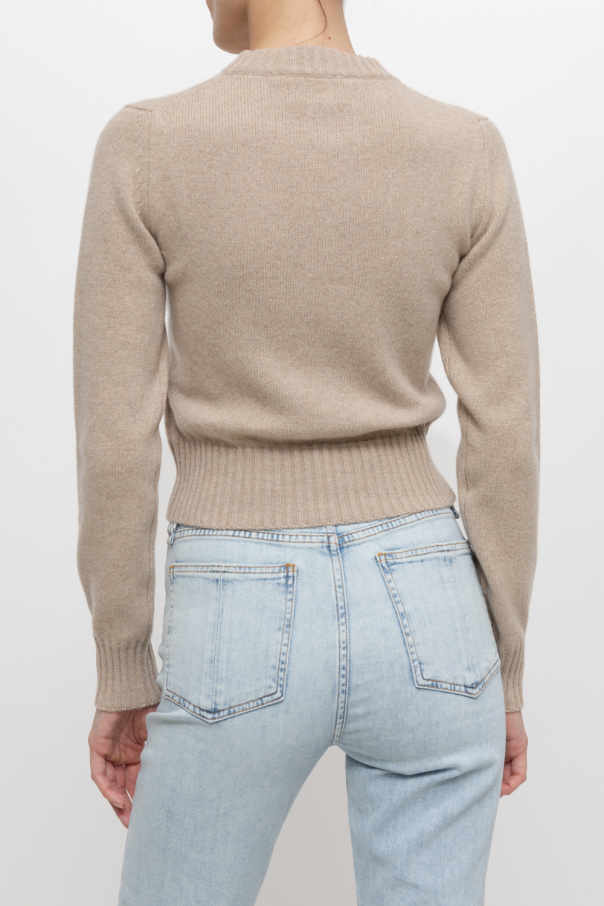 Beige crewneck sweater from Ami Alexandre Mattiussi. Crafted from cashmere, this style features ‘Ami De Coeur’ embroidery on the front and ribbed trims on the collar, bottom hem and cuffs.