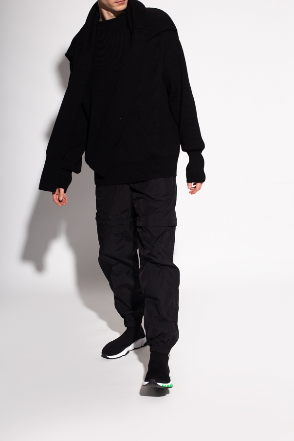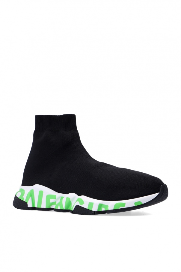 Black ‘Speed LT Graffiti’ sock sneakers from Balenciaga. Boasting a high-top silhouette, this pair sits on a white rubber sole with printed green logo.