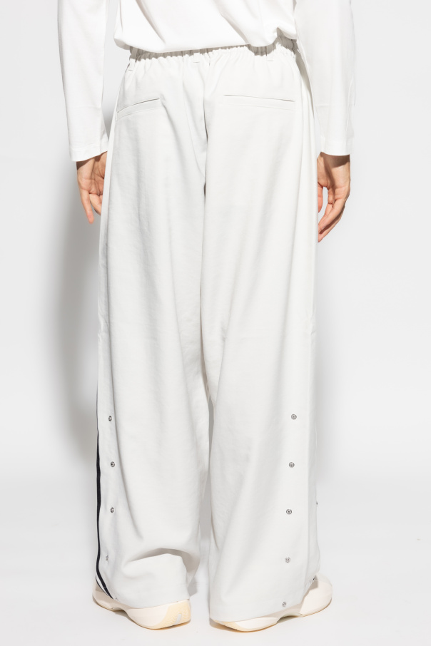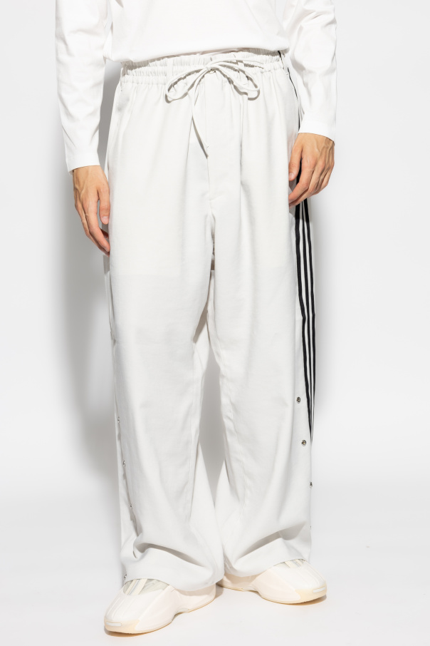 Discover the epitome of comfort and avant-garde design with the Loose-Fit Trousers from the exclusive Y-3 Yohji Yamamoto collection. These trousers, crafted from premium polyester, offer a luxurious touch and impeccable fit. The trousers feature a loose silhouette with wide legs, ensuring a relaxed and unrestricted movement. The dominant cream hue is elegantly complemented by three distinctive black stripes running along the side seams, adding a touch of sophistication and modern flair. Functionality meets style with the inclusion of metal snap buttons along the sides, allowing for adjustable leg width or stylish slits. An elastic waistband with additional drawstrings ensures a customizable fit, while two rear pockets enhance practicality. A subtle designer logo is gracefully positioned near the front pocket, embodying understated luxury. The soft and breathable fabric guarantees comfort, making these trousers a versatile addition to any wardrobe. Why Buy This Product? Exclusive design from the renowned Y-3 Yohji Yamamoto collection Luxurious polyester material for ultimate comfort Adjustable metal snap buttons for versatile styling Elastic waistband with drawstrings for a personalized fit Elegant cream color with distinctive black stripes Subtle designer logo for a touch of sophistication Two practical rear pockets