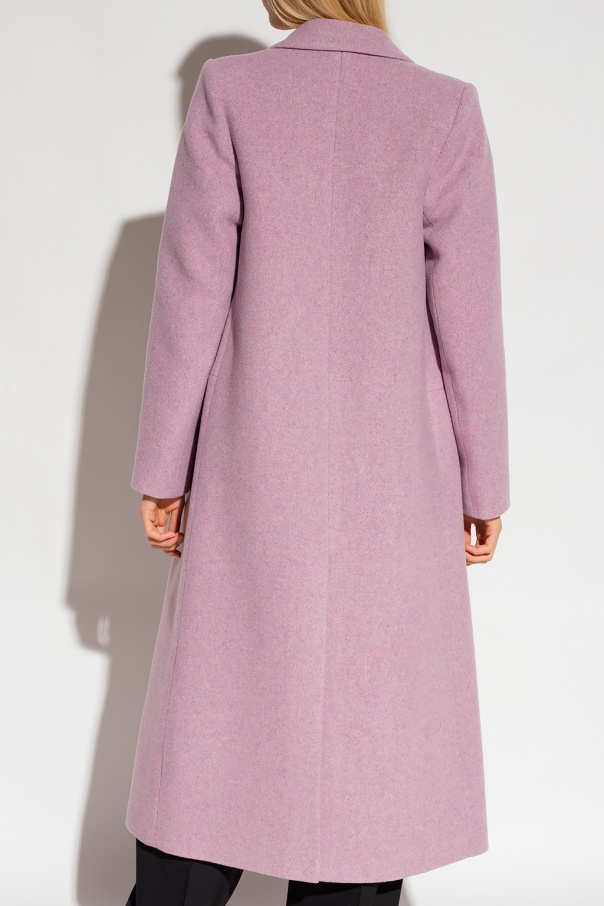 Light purple ‘Falcon’ double-breasted coat from Samsoe Samsoe. Made of a recycled wool blend, this design features button fastenings, peak lapels, two flap pockets, long sleeves and single rear vent.