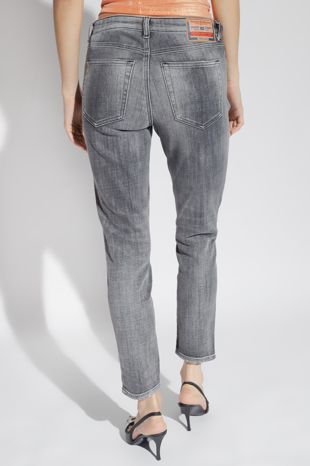 Grey '2015 BABHILA L.30' skinny jeans from Diesel. Emblazoned with logo patches on the front and back, this pair features tapered legs, a zip fly with a button, a vintage effect and classic five pockets.