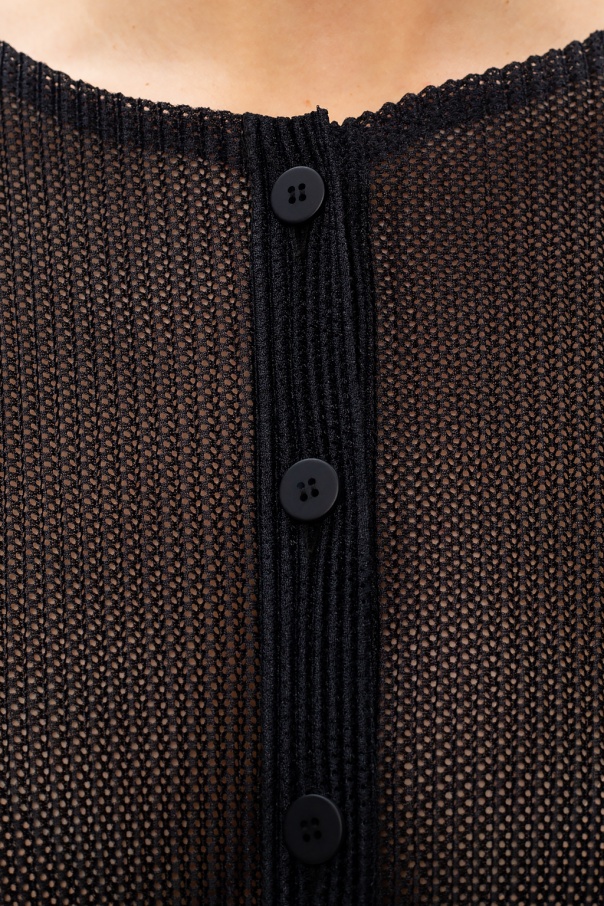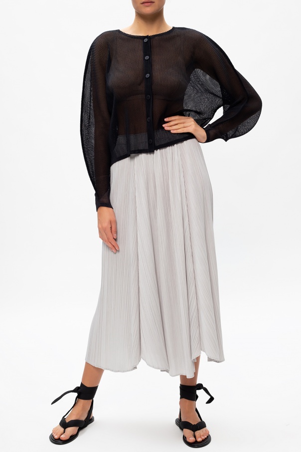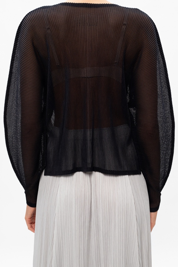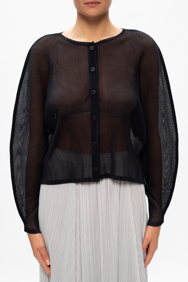 Black semi-sheer cardigan from Issey Miyake Pleats Please. Arrayed with the label's signature pleating, this design fastens via buttons and features round neck and side vents.