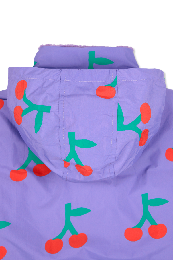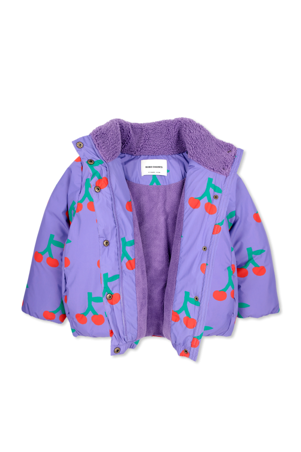 Introducing the exquisitely crafted Cherry-Print Jacket from the prestigious Bobo Choses, designed specifically for young girls aged 4-14. This exclusive piece, draped in a dominant shade of violet, is adorned with whimsical red cherry prints and green stems, creating a delightful and playful aesthetic. Constructed with meticulous attention to detail, the jacket features a high collar for enhanced warmth and a hood embellished with the same charming cherry pattern. The front fastens securely with both buttons and snaps, ensuring a snug fit. An understated yet elegant "BOBO CHOSES" inscription graces the left chest, subtly highlighting the brand's signature. The interior is lined with a plush, soft material in matching violet, providing superior comfort and insulation. Expertly fashioned from recycled polyamide for its exterior, this jacket is both wind and water-resistant, making it a practical choice for cooler days. The inner lining, composed of polyester, ensures an additional layer of coziness. Why Choose This Product? Exclusive design by the renowned Bobo Choses High-quality materials for superior warmth and comfort Wind and water-resistant exterior Stylish and playful cherry print for a unique look Practical features including a high collar, hood, and secure fastenings