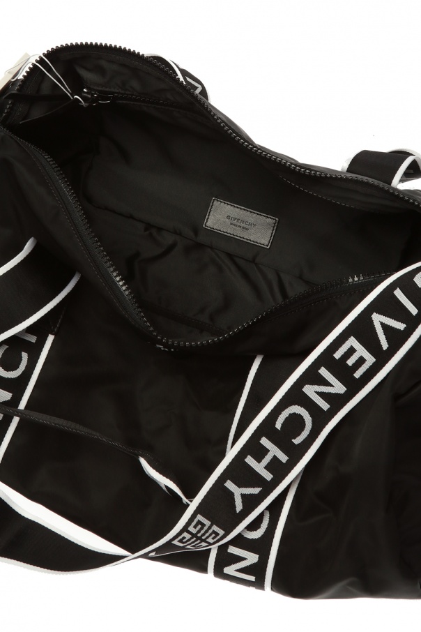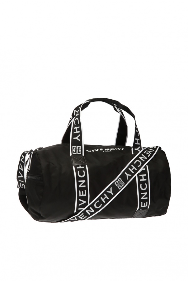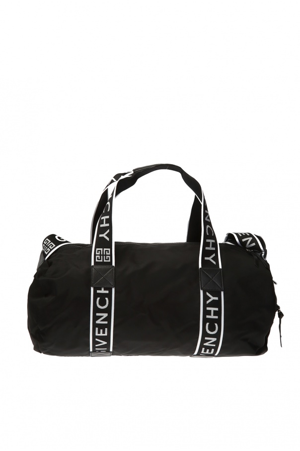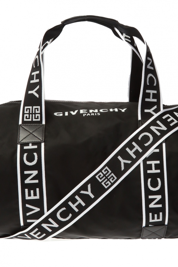 Black and white '4G' holdall from Givenchy featuring zip fastening, white logo print on the front, zip pocket on the side, two half-round handles, a detachable and adjustable shoulder strap, silver-tone metal hardware and interior with one compartment and one zip pocket inside. Item can be used as backpack.